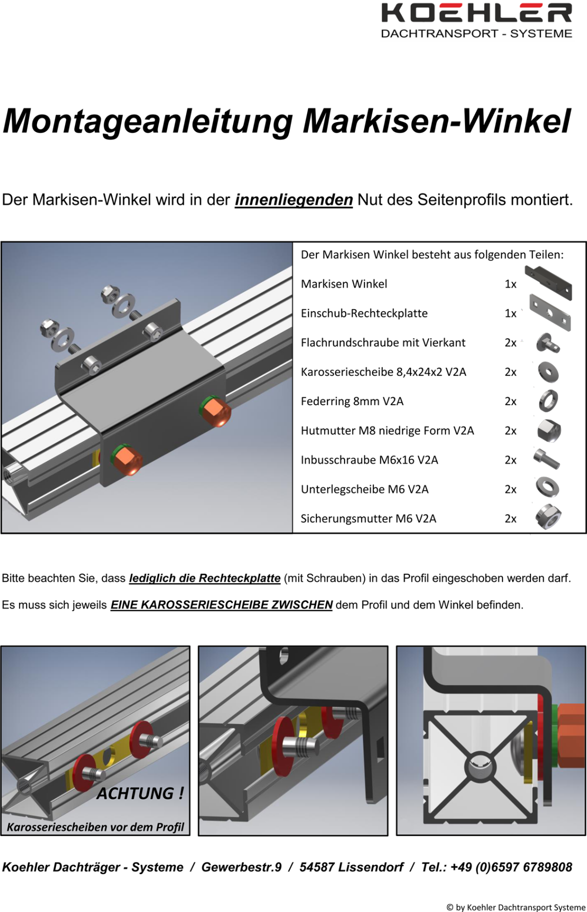 Wichtig ist, dass es sich um Markisen für die Wandmontage handelt. Die bei der Markise bereits enthaltenen Montageplatten werden an den Markisen-Winkeln verschraubt. Alle Winkel beinhalten ein komplettes Schrauben-Set aus Edelstahl. Es werden mindestens 3 Markisen-Winkel pro Dachträger benötigt.